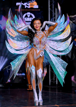 Серебристые высокие ботфорты, голографические крылья и сияющий боди с множеством кристаллов создают эффект звездной энергии и межгалактического блеска. На сцене такая спортсменка выглядит как посланница другой вселенной, излучающая мощь, стиль и харизму.