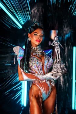 Серебристые высокие ботфорты, голографические крылья и сияющий боди с множеством кристаллов создают эффект звездной энергии и межгалактического блеска. На сцене такая спортсменка выглядит как посланница другой вселенной, излучающая мощь, стиль и харизму.